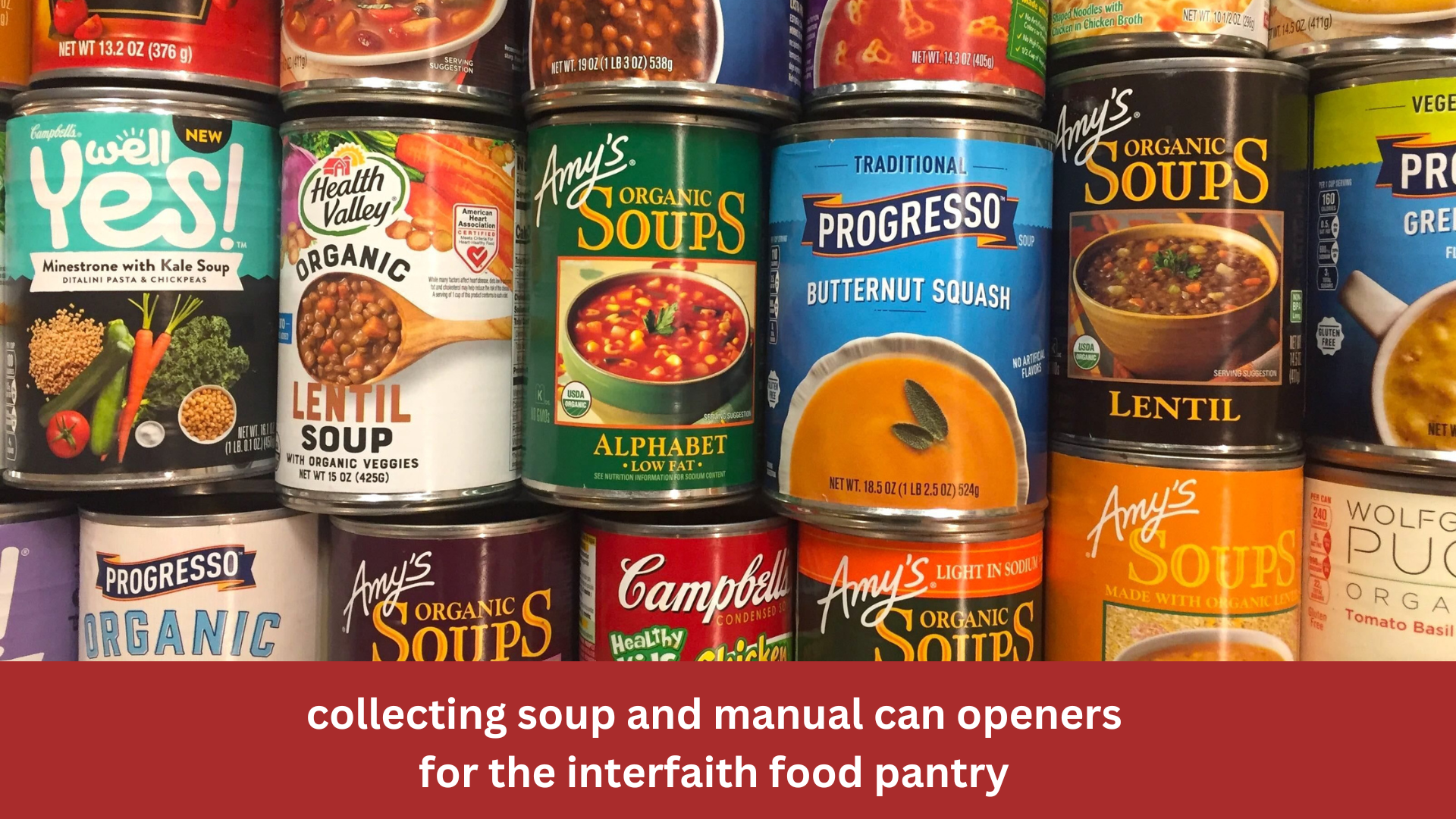 during february, we’re collecting cans of soup and manual can openers for the blacksburg interfaith food pantry. please bring your donations to edges. there’s a shelf in the hallway for your gifts. at the end of the month, we’ll take everything up to the food pantry! thank you for sharing the gift of warm food with our neighbors.